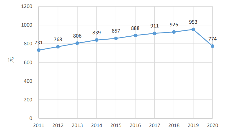 2020年國內(nèi)旅游人均花費(fèi)774.14元,比2019年同比下降18.8%。其中,城鎮(zhèn)居民人均花費(fèi)870.25元,下降18.1%。農(nóng)村居民人均花費(fèi)530.47元,下降16.4%。