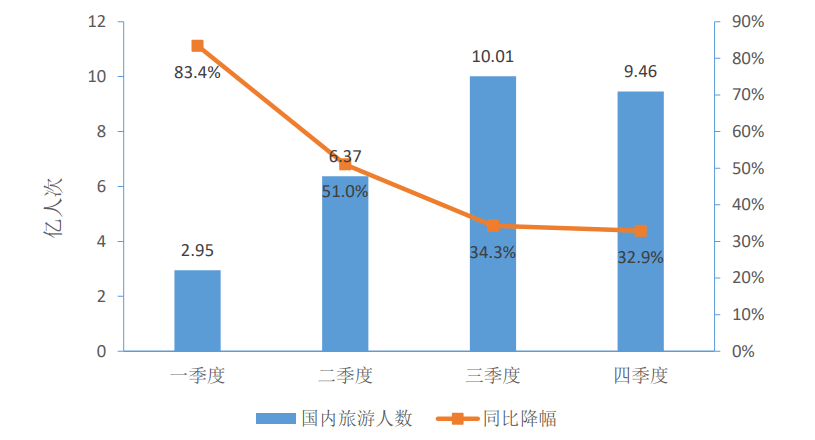 2020年文化和旅游部通過積極爭取紓困政策、指導(dǎo)地方用足用好政策、抓好項(xiàng)目建設(shè)、推動(dòng)產(chǎn)業(yè)創(chuàng)新發(fā)展、加大金融支持產(chǎn)業(yè)高質(zhì)量發(fā)展等措施,推動(dòng)旅游業(yè)復(fù)蘇取得顯著成效,國內(nèi)旅游呈現(xiàn)分季度降幅收窄趨勢。