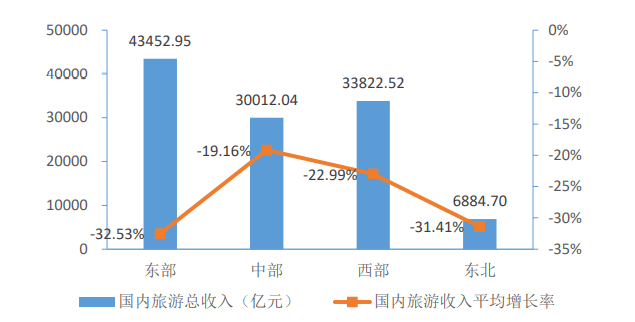 我國東部、中部和西部區(qū)域的國內(nèi)旅游收入也呈現(xiàn)出收斂趨勢,東中西之間的差距在不斷縮小。2020年東部、中部和西部的國內(nèi)旅游收入分別為43452.95億元、30012.04億元和33822.52億元。但是,中部和西部區(qū)域的旅游收入與東部區(qū)域相比還有較大差距。2020年東北區(qū)域國內(nèi)旅游收入為6884.70億元,占全國總收入的6.0%。