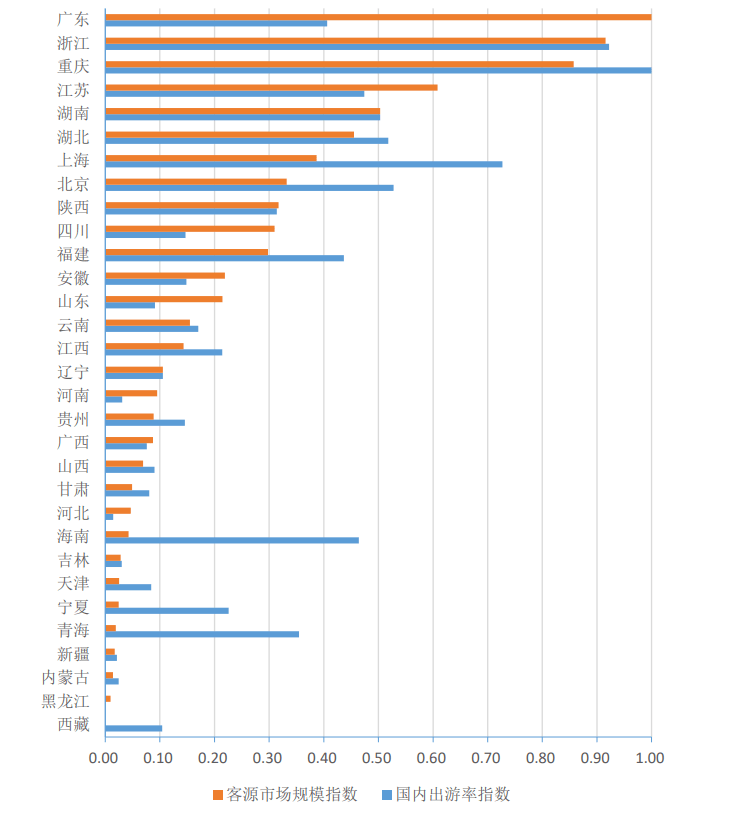 2020年廣東、浙江、重慶、江蘇、湖南、湖北、上海、北京、陜西等省市既有較大的國內(nèi)旅游客源市場規(guī)模,又有較高的國內(nèi)旅游出游率。