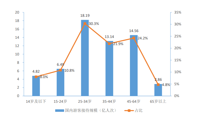 依據(jù)最新的國內(nèi)旅游抽樣調(diào)查資料,2019年國內(nèi)旅游的最主要群體是25-34歲的青年人,占旅游者總量的30.3%。25-44歲的中青年旅游者合計(jì)占到國內(nèi)旅游者總量的52.2%。