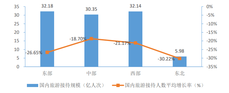 國內(nèi)旅游客源市場呈現(xiàn)出顯著的區(qū)域分布特征。綜合考慮出游次數(shù)和停留時(shí)間,2020年東部區(qū)域占據(jù)了51.5%的國內(nèi)旅游客源市場,其次是西部區(qū)域占據(jù)了26.4%,中部區(qū)域占據(jù)了19.9%,而東北區(qū)域僅占2.1%。