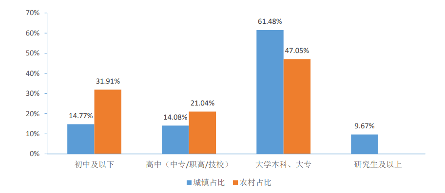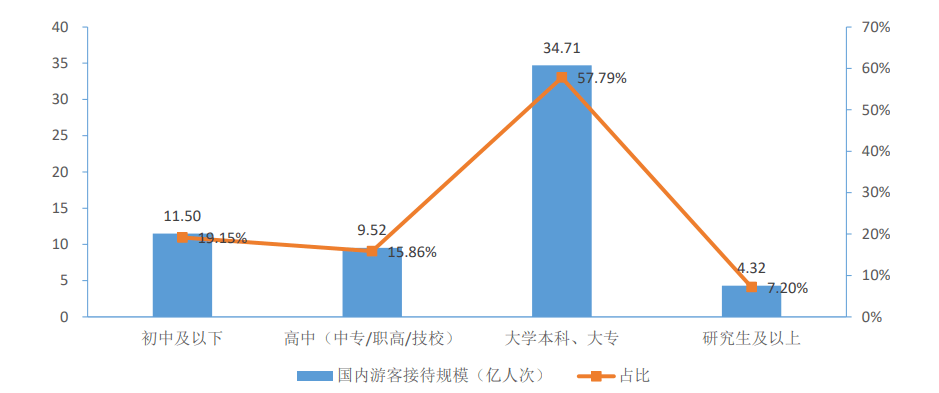 從城鄉(xiāng)國內(nèi)旅游者的分受教育程度比重來看,城鎮(zhèn)國內(nèi)旅游者的受教育程度顯著高于農(nóng)村國內(nèi)旅游者,大學(xué)本科、大專及以上學(xué)歷的國內(nèi)旅游者占比達(dá)到71.15%。