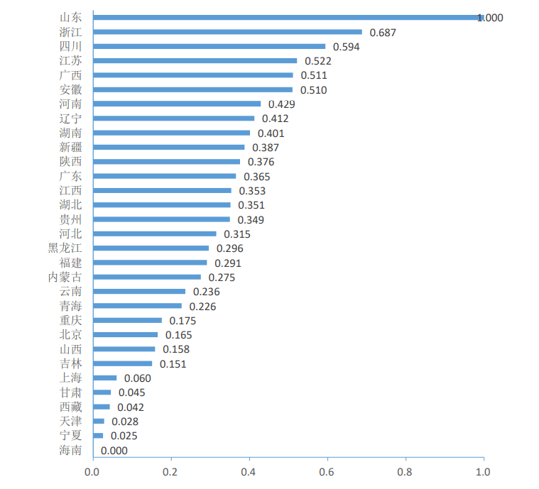 綜合測算旅游景區(qū)的規(guī)模和吸引力后得到各地區(qū)的旅游景區(qū)發(fā)展指數(shù),山東、浙江、四川、江蘇、廣西和安徽等省區(qū)位居全國前列,旅游景區(qū)體系產(chǎn)生較強(qiáng)的旅游吸引力。甘肅、西藏、天津、寧夏、海南等省區(qū)市具有豐富的自然生態(tài)資源和歷史文化資源,但旅游景區(qū)發(fā)展指數(shù)較低,未來應(yīng)在自然資源的可持續(xù)利用、傳統(tǒng)文化的創(chuàng)造性轉(zhuǎn)化和創(chuàng)新性發(fā)展上進(jìn)一步提升。