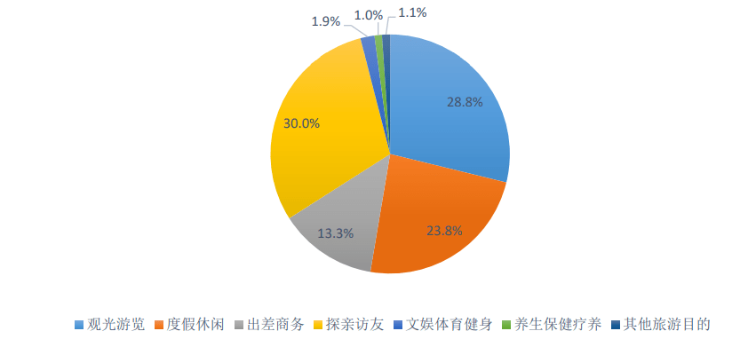 城鎮(zhèn)居民的國內(nèi)旅游目的以探親訪友為主,占30.0%;其次是觀光游覽,占28.8%;再次是度假休閑,占23.8%。