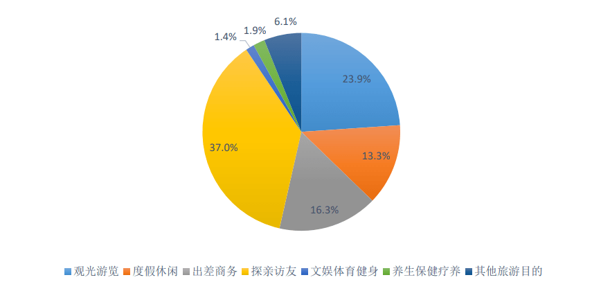 農(nóng)村居民的國內(nèi)旅游目的以探親訪友為主,占37.0%;其次是觀光游覽,占23.9%;再次是商務(wù)出差,占16.3%。