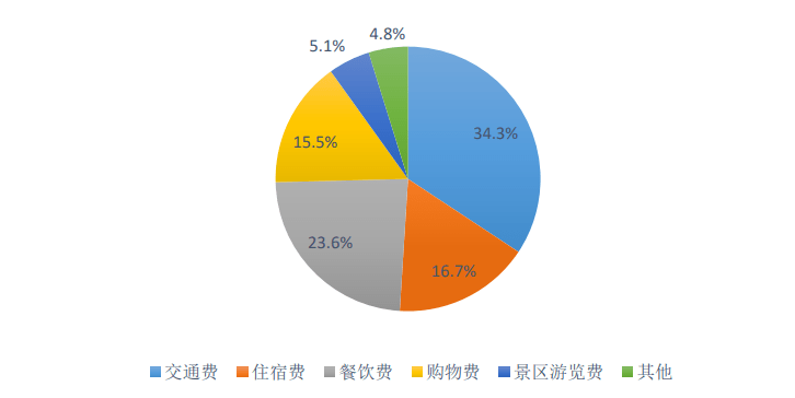 2019年城鎮(zhèn)散客旅游者的出游花費(fèi)中,交通費(fèi)所占比重最高,達(dá)到了34.3%;其次是餐飲費(fèi),占到了23.6%;再次是住宿費(fèi),占到了16.7%。